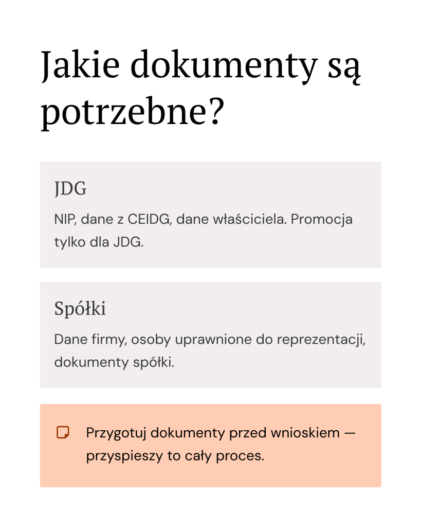 W przypadku jednoosobowej działalności procedura zwykle jest najprostsza. Bank potrzebuje danych właściciela firmy i informacji o samej działalności. Chodzi między innymi o dane identyfikacyjne, numer NIP i dane zgodne z wpisem w CEIDG. Co ważne, konto promocyjne jest kierowane właśnie do osób prowadzących JDG, a nie do wspólników spółki cywilnej. To istotny szczegół, bo wiele osób zakłada, że każda mała firma wchodzi tu automatycznie w grę. A tak nie zawsze jest.