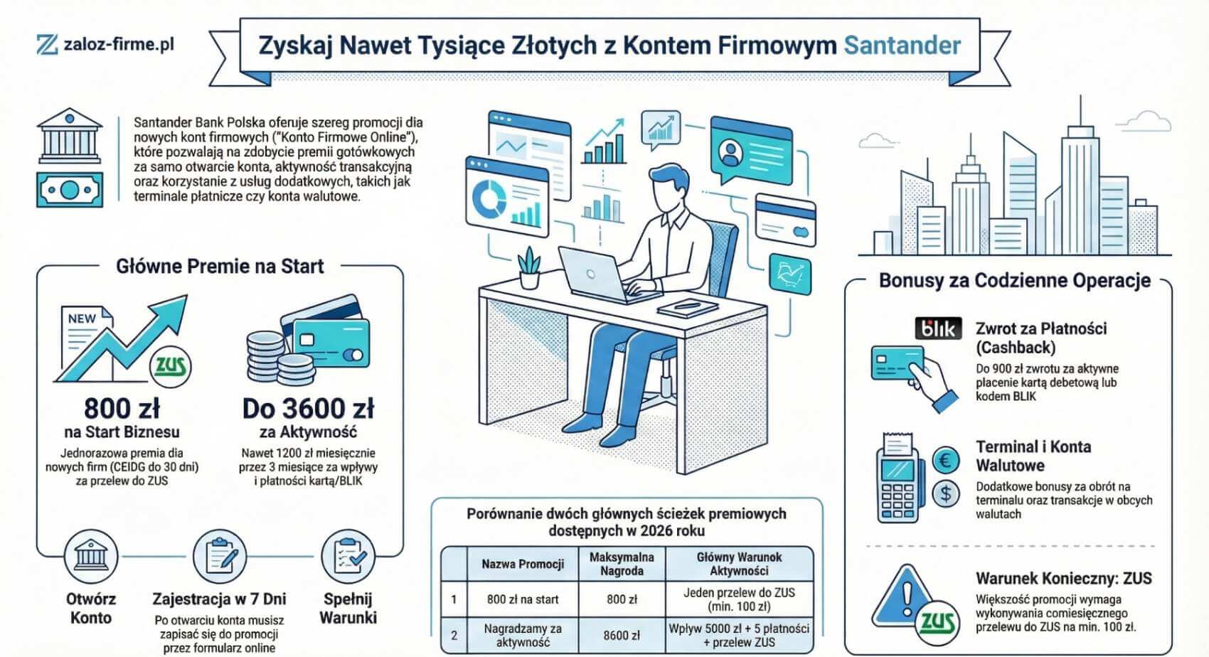 Santander kieruje swoją ofertę do różnych typów przedsiębiorców. Najbardziej naturalnym wyborem będzie konto dla jednoosobowej działalności. To właśnie ono pojawia się w kontekście promocji i warunków dla nowych klientów. Jeśli prowadzisz JDG, chcesz mieć prosty dostęp do przelewów, historii operacji i codziennej obsługi firmy, taki wariant zwykle będzie pierwszym krokiem. Wierzę mocno, że dla małego biznesu liczy się prostota. Nie rozbudowane dodatki na siłę, ale wygoda w codziennym użyciu.