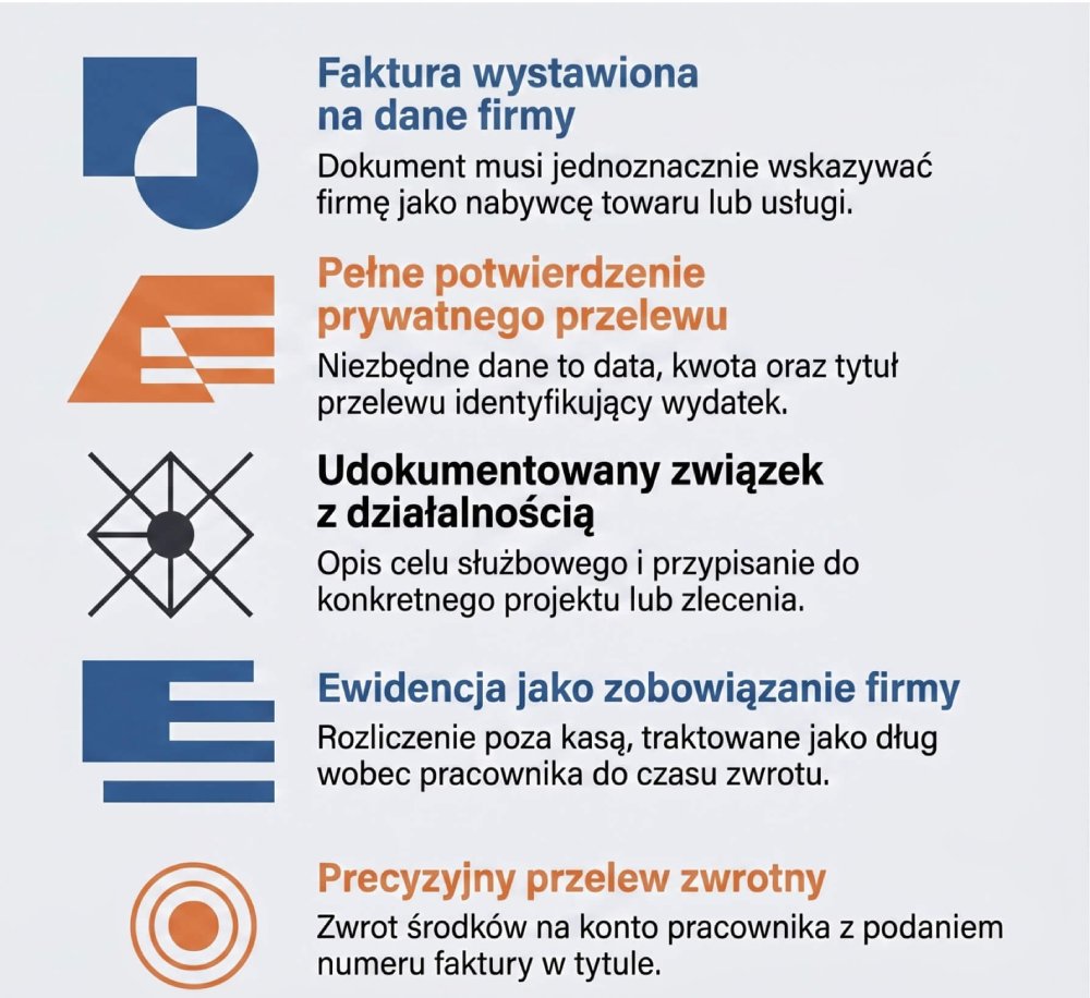 Ewidencja nie może sugerować, że zapłata poszła z firmowej kasy. Pieniądze wyszły przecież z konta pracownika. Dlatego tak ważna jest ścieżka dowodowa. Pokazuje źródło finansowania i sposób ujęcia kosztu, bez domysłów i skrótów.